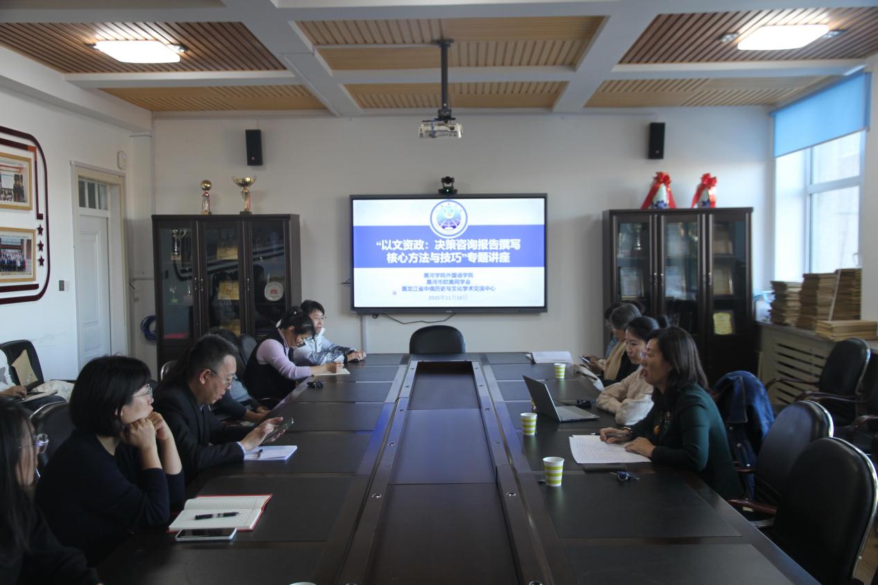 为提升教师研究成果转化与决策建议撰写能力,11月10日,我院联合黑龙江省中俄历史与文化学术交流基地、黑河市欧美同学会,特别邀请远东研究院副研究员鲁京京老师主讲“以文资政:决策咨询报告撰写核心方法与技巧”专题讲座。外国语学院学科带头人、学术骨干、博士、在读博士及各系、教研室主任共同参与本次活动。