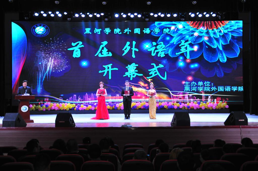 外国语学院首届“外语年”活动于2017年5月10日下午2:00在我校明德楼大礼堂拉开序幕,为我院学子呈现了一场丰富的文化盛宴。本届“外语年”系列活动得到了俄罗斯合作伙伴“俄罗斯世界基金会”的大力支持,并发来贺信以示祝贺。出席本次开幕式的领导有:黑河学院党委曹百瑛书记,黑河学院党委李廷栋副书记,黑河学院车永宏副校长,黑河学院纪委董贵杰书记,黑河学院许海深副校长及相关部门、各学院领导、我院全体师生。