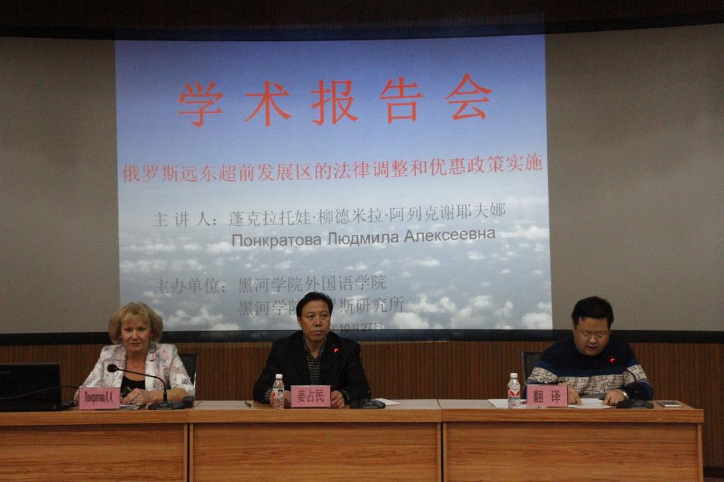 应外国语学院俄罗斯研究所邀请,俄罗斯阿穆尔国立大学国际关系系主任、俄罗斯科学院远东研究所阿穆尔分所所长彭克拉托娃·柳德米拉·阿列克谢耶夫娜女士于2017年10月27日下午2:00 – 4:00在俄语楼小剧场为我校师生举办了题为《俄罗斯远东超前发展区的法律调整和优惠政策实施》的学术讲座。彭克拉托娃所长从俄罗斯国家领导人对超前发展区建设工作的重视、俄罗斯针对超前发展区建设制订的法规和发布的行政命令,到超前发展区的数量、分布及各个超前发展区的现状和特点,及在超前发展区开展的与中国合作,进行了全面、详细的阐述。