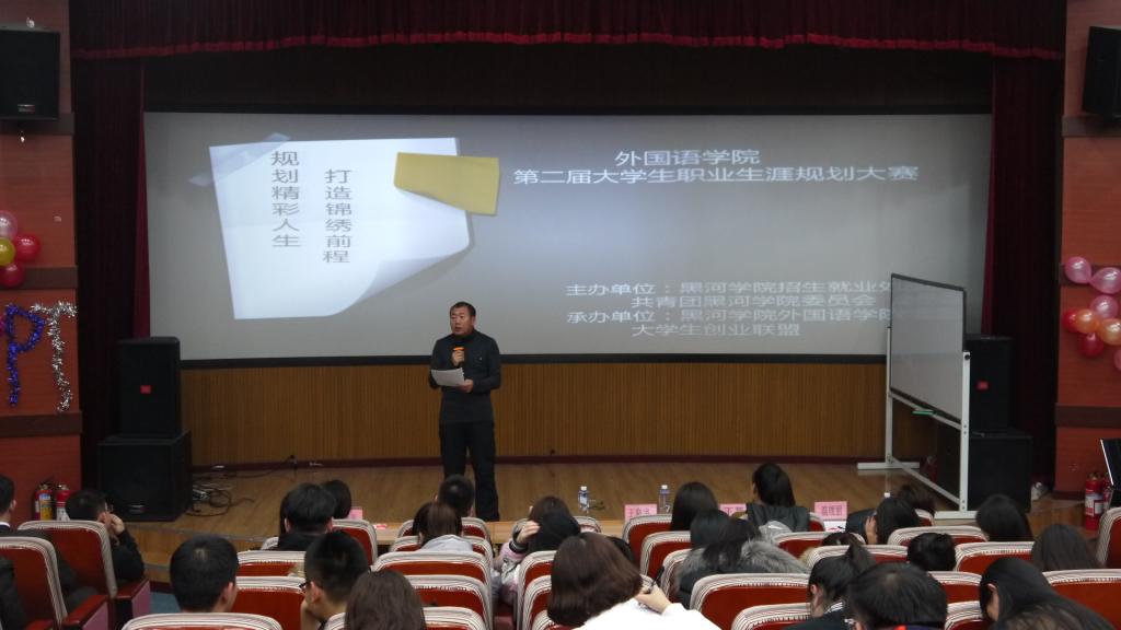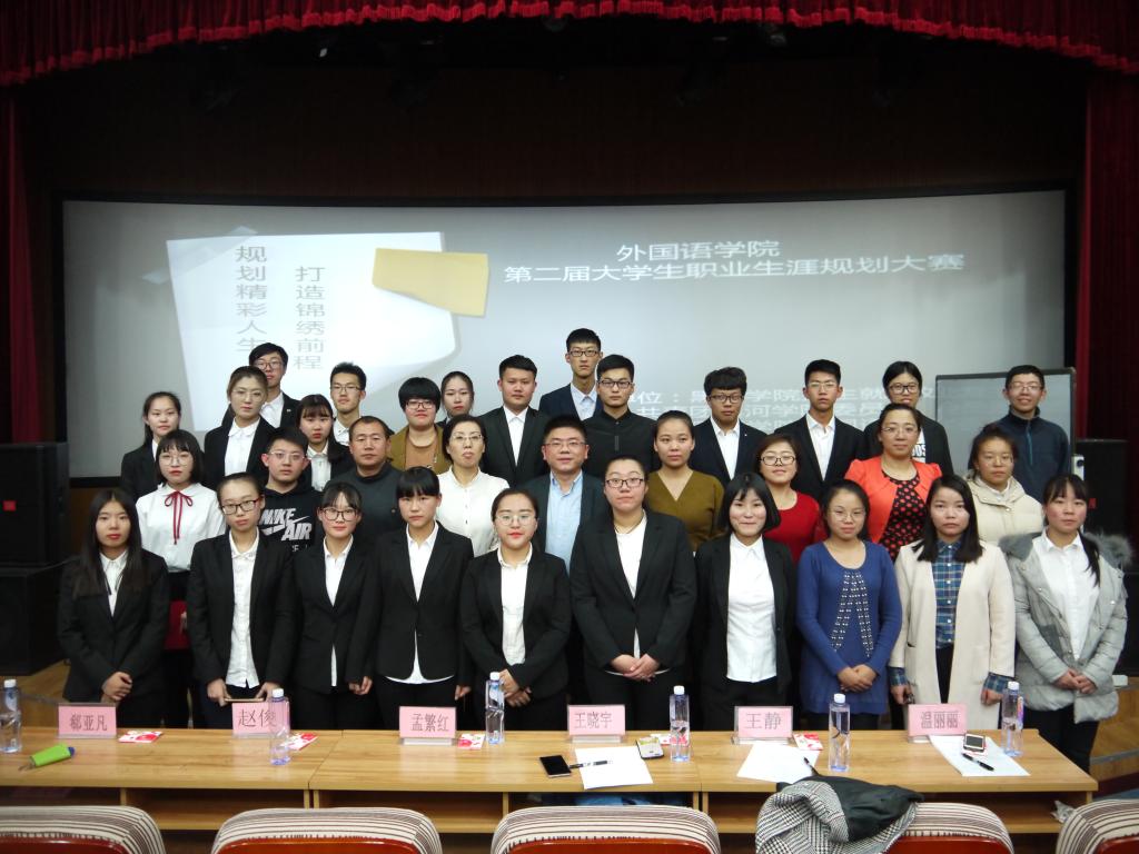 2017年11月6日晚6点,在俄语楼小剧场大学生职业生涯规划大赛隆重举行。出席的嘉宾有外国语学院党总支书记孟繁红、辅导员郗亚凡、祁立伟。邀请通识学院副院长王晓宇、北安新世纪教育培训机构校长王静以及外国语学院辅导员温丽丽作为本次大赛的评委,同时我们很荣幸邀请到了布衣鸿儒总经理赵俊先生出席本次活动。