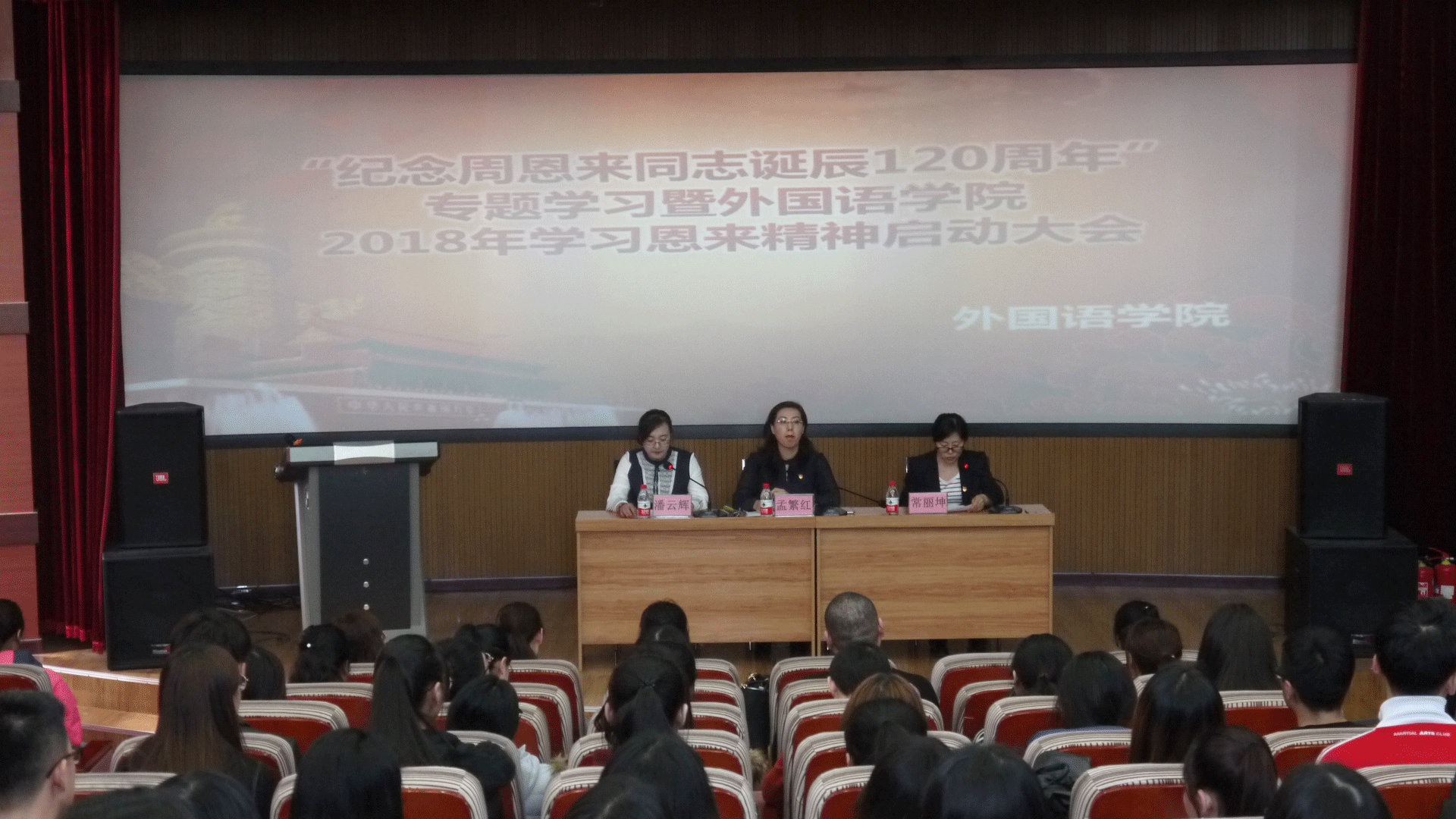 2018年3月21日14时,“纪念周恩来同志诞辰120周年”专题学习暨外国语学院2018年学习恩来精神启动大会在俄语楼小剧场拉开帷幕。出席本次大会的嘉宾有外国语学院党总支书记孟繁红,党总支副书记常丽坤,学工办主任潘云辉以及全体辅导员和班主任老师。