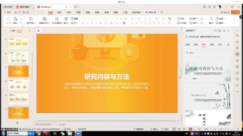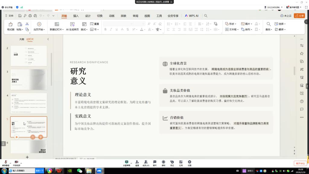 与此同时,线上开题汇报通过腾讯会议同步进行。18名身处外地实习或备考的学生依次共享屏幕,远程展示开题报告PPT,并进行实时陈述。尽管隔着屏幕,线上答辩同样严谨规范,教师通过视频连线逐一点评,提问环节互动热烈,网络两端实现了“虽隔千里,如在现场”的学术交流。