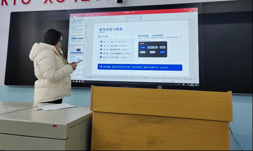 下午13时,开题汇报在207和209教室同步启动。46名毕业生依次登台,围绕选题背景、研究意义、文献综述、研究方法及预期成果等方面进行陈述。本次选题紧扣时代脉搏与专业特色,呈现出多元化、跨学科的特点。有学生聚焦国际品牌传播,以“多模态话语分析视角下的国际品牌广告翻译研究”为题,探讨语言与图像协同构建品牌意义的机制;有学生关注新兴业态,选择“亚马逊跨境直播中商务英语营销话语策略研究”,将话语分析与跨境电商实践相结合;还有学生将目光投向文化输出,以“流媒体时代的品牌叙事:讯飞平台中国剧集英语推广话语构建研究”为选题,分析中国文化“出海”的语言策略。此外,“内陆地区跨境电商零售出口的物流困境与对策研究”、“基于输出驱动假设视角的商务英语专业学生口语能力自我培养的有效途径研究”等选题,则从产业痛点与教学改革角度出发,体现了学生的问题意识与现实关怀。教师们认真听取陈述,结合选题的创新性、可行性与规范性进行提问与点评,帮助学生进一步厘清思路、明确方向。