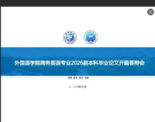 本次开题汇报在全体师生的共同努力下圆满完成。毕业论文是本科人才培养的重要环节,开题则是论文工作的“第一粒扣子”。商务英语专业始终严把论文质量关,从选题指导、开题答辩到后续写作、查重、答辩,层层把关。本次开题不仅帮助学生明确了研究路径,更通过师生间的深度交流激发了学术思考,为后续论文写作奠定了坚实基础。