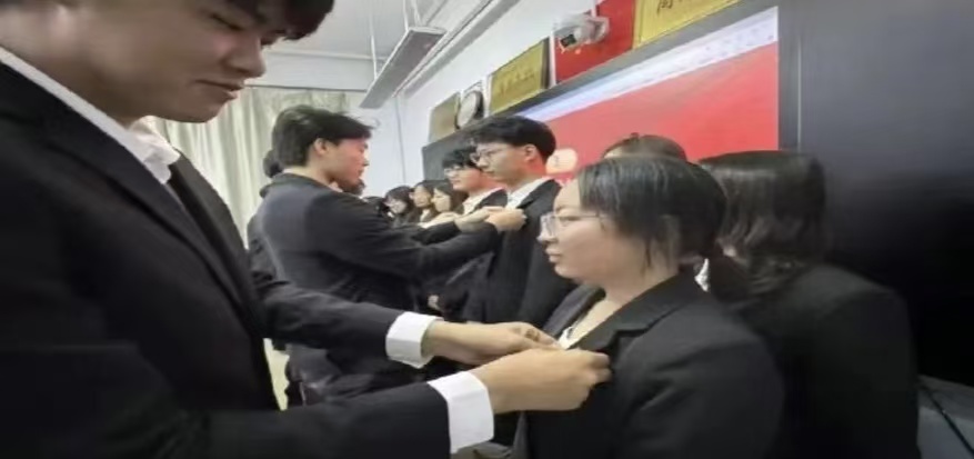 最后,外国语学院学生团委组部部长与部员为全体新团员逐一佩戴团徽,闪耀的团徽在胸前熠熠生辉,标志着新团员正式成为共青团大家庭的一员。仪式在嘹亮的团歌声中圆满落幕。此次仪式既是青春的见证,更是责任的传递,新团员们将以团徽为指引,在求学路上砥砺奋进,为学院发展和团组织建设贡献青春力量。