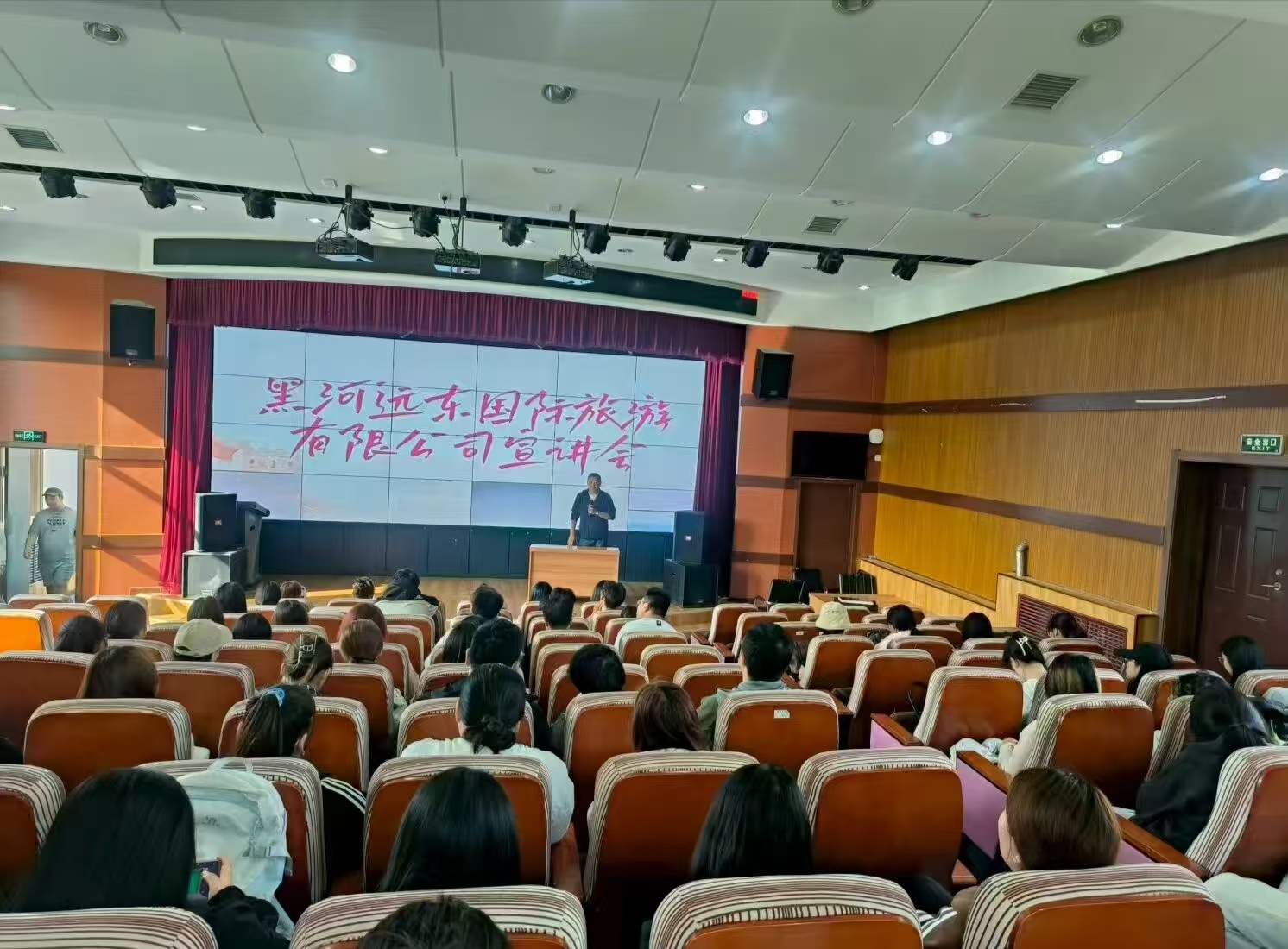 紧接着,黑河远东国际旅游有限公司负责人孙旭进行线下宣讲。他结合企业深耕中俄边境旅游的资源优势,全面介绍业务覆盖范围,重点聚焦中俄跨境旅游线路规划、俄语导游服务、国际游客接待及文化交流活动策划等核心板块,强调俄语人才在促进中俄旅游合作、提升游客体验中的关键作用。针对招聘岗位,孙旭明确俄语导游、跨境旅游产品专员的需求,除要求具备扎实的俄语听说读写能力外,还需熟悉中俄文化差异及旅游行业规范;同时提及新员工可享受为期两周的岗前培训,内容涵盖线路实操、服务标准及应急处理流程,并配备经验丰富的导游进行“一对一”带教,助力学生快速适应旅游行业工作节奏。