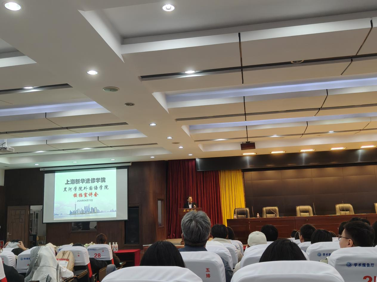 为搭建校企对接桥梁、拓宽学子就业渠道,切实助力毕业生实现高质量就业,2026年4月15日,外国语学院在求知楼报告厅成功举办上海新华进修学院专场招聘宣讲会。上海新华进修学院赵院长一行4人莅临现场,外国语学院辅导员朱红宇、侯蔓丽、贺然全程到场指导,2022级、2023级学生积极参与,近距离对接企业招聘需求,把握职场发展新机遇。
